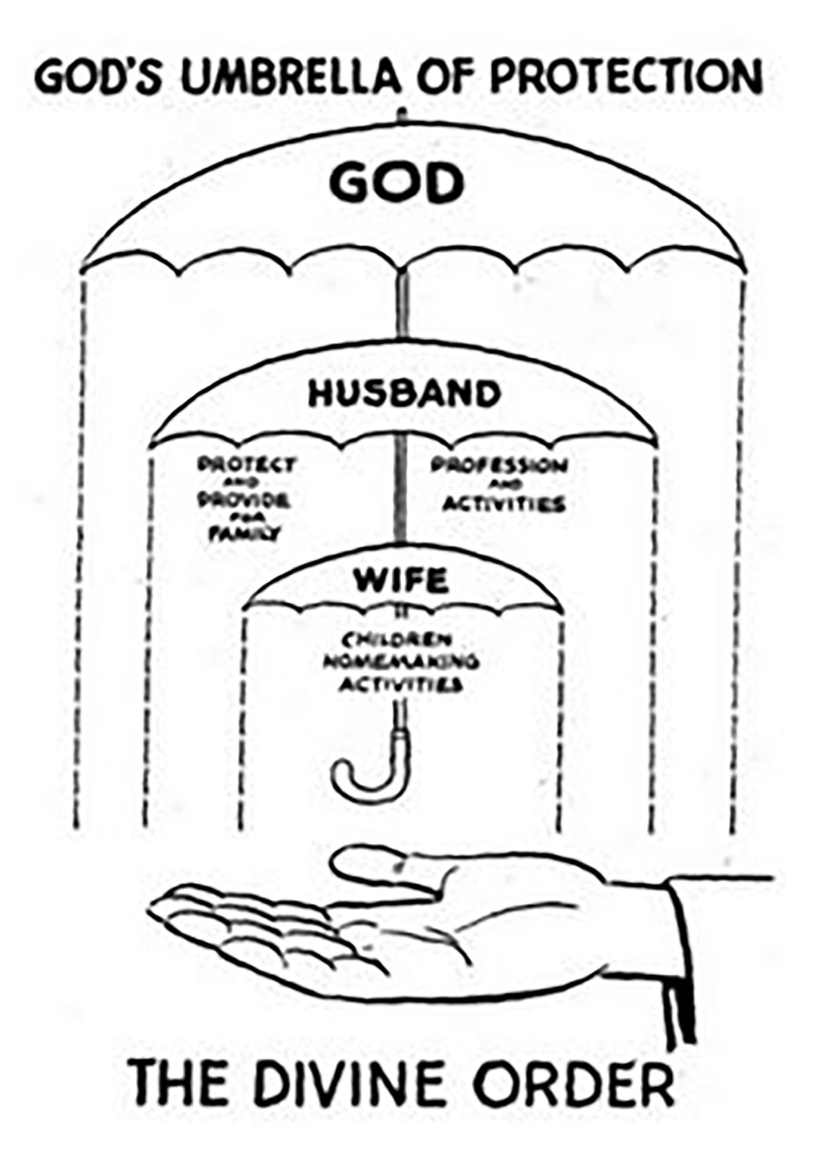 The division of labour is remastered in good faith; God's 'Umbrella of Protection' is taught to his children, devoted to a dynasty where He is the Father; the creator and the decider. All those under his umbrella will be rewarded, providing they stay & pray ... to him. The rules are more relaxed in corporate political circles where appearances take on a less puritan demeanor and there is a facade of equality between the sexes. In this muted makeover, nubile girls and wayward women are pretty pawns who look a lot like Playboy bunnies at first, before they become used, impregnated and discarded; still speaking on his behalf, echoing his lies and reinforcing his word like it's a new prayer to be followed and obeyed, fearing punishment should they not. Playful.